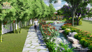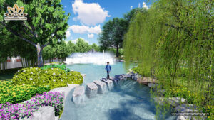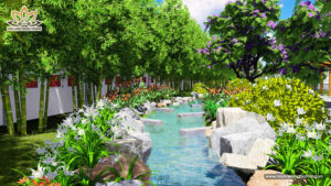 Suối Thanh Long tại Dự Án Hoa Viên Bình An được thiết kế như một dải lụa uốn quanh khuôn viên rộng 50ha, dựa trên nguyên tắc “tả Thanh Long, hữu Bạch Hổ” trong phong thủy học: